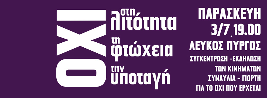 Μεγάλη εκδήλωση και συναυλία υπέρ του ΟΧΙ στο δημοψήφισμα της Κυριακής διοργανώνεται αύριο, Παρασκευή 3 Ιουλίου στις 19:00, στο Λευκό Πύργο της Θεσσαλονίκης. Τα κινήματα της Θεσσαλονίκης λένε ΟΧΙ στα μνημόνια, στη λιτότητα, στη φτώχεια και στην υποταγή! Οι καλλιτέχενες που συμμετέχουν στη συναυλία είναι οι: