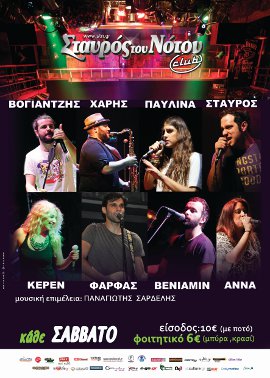 Να λοιπόν! Ακόμα ένα βράδυ μας βρίσκει στην Φραντζή και Θαρύλου γωνία έξω από τον Σταυρό του Νότου Club. Αυτή τη φορά για να ξαναδούμε και να περάσουμε καλά με τους σπιτονοικοκύρηδες του Σταυρού, την house band, που τόσα χρόνια κάνει την ίδια δουλειά. Μας ανεβάζει και μας ξεναγεί στο alternative, funk, rock, έντεχνο αλλά και blues, σε διάφορες μορφές ελληνικού και ξένου ρεπερτορίου.