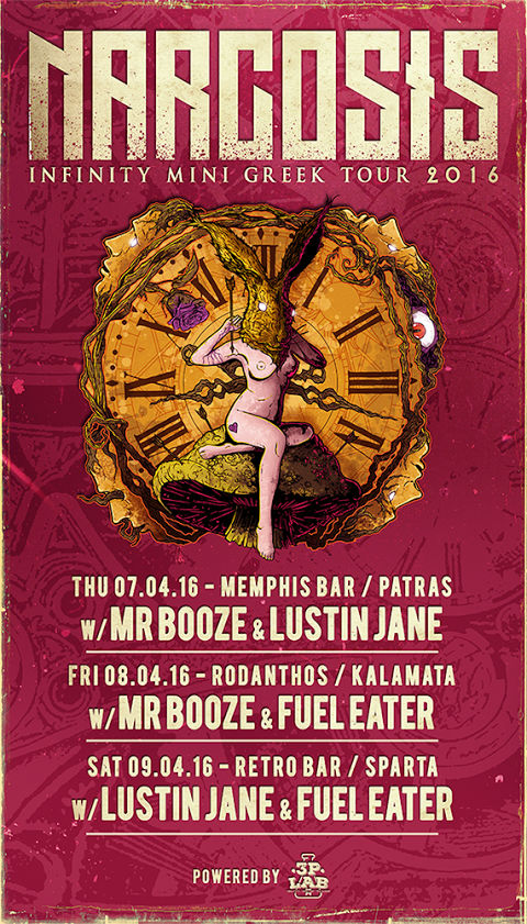 Οι αθηναίοι heavy / grunge / alternative rockers Narcosis, μετά την κυκλοφορία του παρθενικού τους “Road To Infinity” full length album, στα τέλη του 2015 και σωρεία εμφανίσεων στην Αθήνα (μία εκ των οποίων, στο πλευρό των Αμερικανών punk-rockers Barb Wire Dolls), ανακοίνωσαν τρεις ημερομηνίες στην ελληνική επικράτεια, που θα συστήσουν ένα “mini Greek tour” και θα τους επιτρέψουν να παρουσιάσουν το νέο τους υλικό εκτός της πόλης τους.