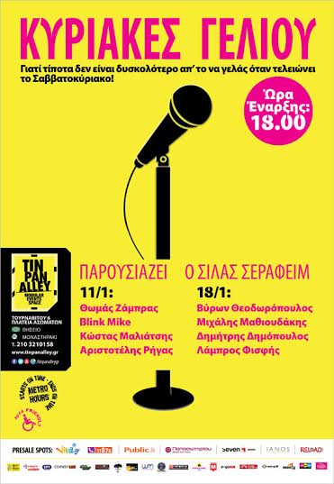 Κάθε Κυριακή, στις 18.00 μ.μ., ο Σίλας Σεραφείμ παρουσιάζει στο Tin Pan Alley ό, τι καλύτερο έχει αναδείξει η stand up σκηνή της Ελλάδας. 4 κωμικοί εναλλάσσονται και μεταμορφώνουν τα μελαγχολικά Κυριακάτικα απογεύματα.