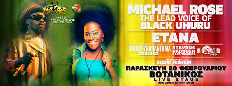 Η προγραμματισμένη συναυλία των Michael Rose & Etana (Βοτανικός 20/2/2015) αναβάλλεται για τεχνικούς λόγους. Η νέα ημερομηνία θα ανακοινωθεί σύντομα. Η διοργανώτρια εταιρία βρίσκεται σε συνεχή επικοινωνία με το Management των καλλιτεχνών. Θα επανέλθουμε άμεσα για τις λεπτομέρειες της νέας ημερομηνίας και των χρηστικών οδηγιών για τους Κατόχους των εισιτηρίων. Ευχαριστούμε για την κατανόηση.