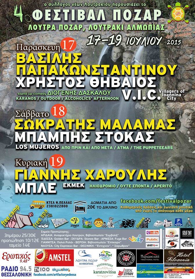 Ένας από τους μαγευτικότερους τόπους της Ελλάδας που συνδυάζει νερό και βουνό μαζί με....αγαπημένες μουσικές! Το Φεστιβάλ Πόζαρ 2015 θα διεξαχθεί στα Λουτρά Αλμωπίας "Πόζαρ" στις 17, 18 και 19 Ιουλίου ~ Πόζαρ Αλμωπίας, Ν.Πέλλας.